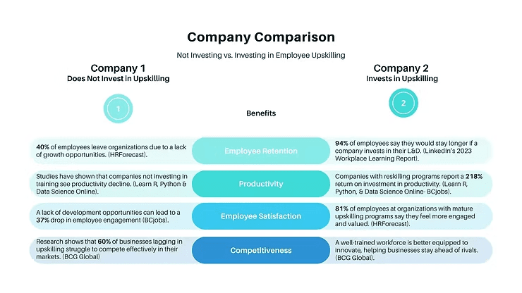 For example, AI tools that handle data analysis, customer service, project management, and even creative work like content generation are already in use. Companies that fail to upskill their workforce now will find their employees unprepared for the rapid shift, with no clear path forward.